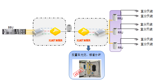 采用無源擴容器后,從BBU設備側,通過無源擴展器收斂3個扇區(qū)的CPRI信號后變成1芯光纜出局,傳輸到RRU側,再通過同樣的無源擴展器分離三個扇區(qū)的信號。最后通過跳纖和各RRU連接。
