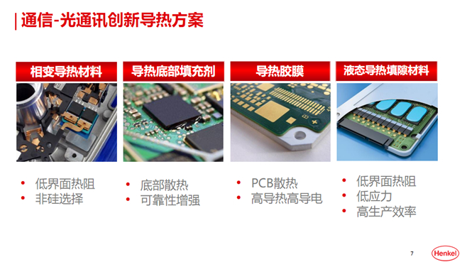 由于流量的急劇增長對光器件發(fā)展提出了更高要求,器件速率升級對小型化、緊湊型、低功耗需求使導(dǎo)熱能力成為模塊廠商之急需。導(dǎo)熱材料在光器件領(lǐng)域具有極高價(jià)值,更高帶寬、更高能量密度以及緊湊的產(chǎn)品,需要更強(qiáng)的導(dǎo)熱能力。因此,漢高集團(tuán)從材料的角度給出了適合光通訊的導(dǎo)熱解決方案。