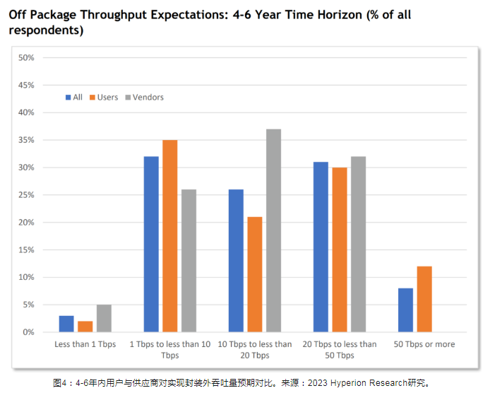 盡管用戶和供應(yīng)商都認可光互連前景,但對其成熟時間預(yù)期有差異。圖3和圖4比較用戶和供應(yīng)商對2年內(nèi)和4-6年內(nèi)實現(xiàn)的封裝外吞吐量預(yù)期。用戶預(yù)計4-6年內(nèi)實現(xiàn)50 Tbps鏈接,而大多數(shù)供應(yīng)商認為20-50 Tbps仍需5年以上。但兩者都看好光互連在不久后將迅速突破10 Tbps,相比當前電互連提升10倍。要實現(xiàn)這一增益,標準和生態(tài)必須進化支持光集成。Ayar Labs通過提供處理器封裝內(nèi)的光輸入輸出“chiplets”,旨在加速商業(yè)采用。通過互操作光組件避免專有接口,平滑光互連發(fā)展之路。