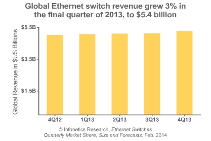 *2013年四季度全球以太網(wǎng)交換機(jī)收入環(huán)比上漲3%,同比增長(zhǎng)3%,達(dá)到54億美元;