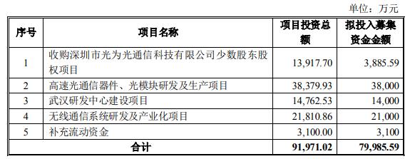 2021 年 2 月 19 日,公司召開(kāi)第四屆董事會(huì)第七次會(huì)議審議通過(guò)《關(guān)于公司 2021 年度非公開(kāi)發(fā)行 A 股股票方案的議案》,2021 年 3 月 9 日,公司召開(kāi)2021 年第一次臨時(shí)股東大會(huì),審議通過(guò)了公司非公開(kāi)發(fā)行股票的相關(guān)事項(xiàng)。根據(jù)相關(guān)議案,公司擬分別使用募集資金 38,000 萬(wàn)元、14,000 萬(wàn)元投入“高速光通信器件、光模塊研發(fā)及生產(chǎn)項(xiàng)目”、“武漢研發(fā)中心建設(shè)項(xiàng)目”。2021 年 11月,公司采用非公開(kāi)發(fā)行股票的方式向特定投資者共計(jì)發(fā)行 64,216,766 股普通股股票,扣除發(fā)行費(fèi)用(不含稅)后實(shí)際募集資金凈額 799,855,866.44 元。