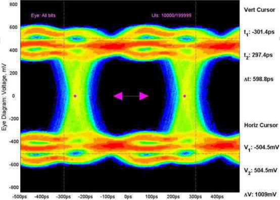 這種架構(gòu)在原理上是可行的,但是在實(shí)際測(cè)試中發(fā)現(xiàn)使用芯片時(shí)鐘得到的TDECQ可能比使用外置CRU的反而更好。造成這個(gè)差異的主要原因是協(xié)議規(guī)定CRU中PLL帶寬只有10Mhz,會(huì)過(guò)濾掉光信號(hào)中的高頻抖動(dòng)成分。而芯片時(shí)鐘輸出可以做到和光信號(hào)完全同步。在光信號(hào)本身存在較大高頻抖動(dòng)分量時(shí),用芯片時(shí)鐘反而獲得更好的TDECQ。以下面三幅眼圖對(duì)比為例,同一個(gè)1Gbps NRZ信號(hào)在CRU PLL帶寬為635kHz,1500kHz和5000kHz時(shí)的眼圖存在明顯差異。造成差異的原因就是這個(gè)1Gbps信號(hào)抖動(dòng)頻譜中包含了719kHz和1383kHz這兩個(gè)高頻分量。需要注意的是最終用戶一般都會(huì)依據(jù)IEEE協(xié)議規(guī)范使用CRU測(cè)TDECQ,在產(chǎn)線使用芯片時(shí)鐘輸出做為觸發(fā)可能會(huì)導(dǎo)致不符合規(guī)范要求的產(chǎn)品流到客戶處。