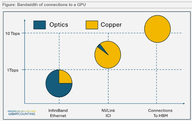 目前,AI集群中部署的光收發(fā)器,90%以上用于InfiniBand和以太網(wǎng)連接。谷歌是唯一一家在其人工智能生產(chǎn)集群中使用光收發(fā)器進行TPU之間的核心互連(Inter-core interconnect,ICI)的公司。英偉達正在其研究集群中測試光學(xué)NVLink與GPU的連接。如下圖所示,NVLink連接到GPU所需的帶寬比以太網(wǎng)和InfiniBand高4倍。AI集群設(shè)計中的另一個瓶頸是GPU可用的高帶寬內(nèi)存(HBM)有限,這也是帶寬提高3倍的另一因素,如下圖所示。