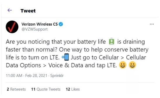 在周日上午的一條推文中,Verizon 支持部門建議,如果用戶發(fā)現(xiàn)他們的電池 “比正常情況下消耗得更快”,“幫助節(jié)省電電量的一個方法是打開 LTE”。當然,這樣就需要關閉 5G 手機的 5G 網絡功能。另外值得指出的是,在進行這一步時,用戶實際上并沒有 “開啟 LTE”,因為 LTE 總是作為 5G 網絡的后備功能而啟用。Verizon 這樣說顯然是為委婉一些,避免直接告訴用戶 “關閉 5G”。