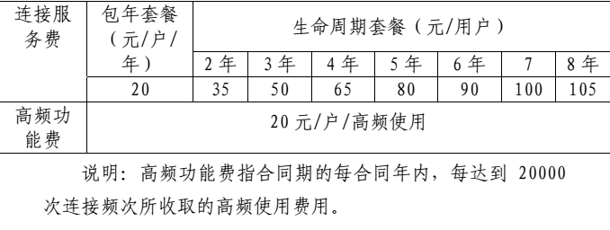 從該套餐收費(fèi)標(biāo)準(zhǔn)可以發(fā)現(xiàn),中國電信NB-IoT套餐分為連接服務(wù)費(fèi)和高頻功能費(fèi)。連接服務(wù)費(fèi)又分為包年套餐和生命周期套餐。包年套餐20元每戶;生命周期套餐分為2年—8年,七個(gè)檔位。價(jià)錢隨年份的增多依次遞增,最低是每用戶35元,最高是每用戶105元。而高頻功能費(fèi)只有一種收費(fèi)標(biāo)準(zhǔn),每戶20元。