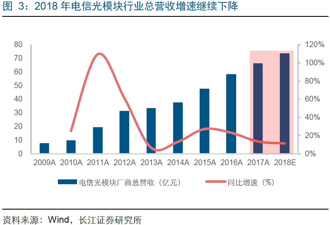 2018 年前三季度,光模塊行業(yè)營(yíng)收和業(yè)績(jī)加速下滑,第三季度由于“中興事件”落地帶來(lái)的需求恢復(fù)性增長(zhǎng)驅(qū)動(dòng)營(yíng)收和業(yè)績(jī)環(huán)比改善,第四季度在高基數(shù)基礎(chǔ)上難以繼續(xù)維持顯著的環(huán)比增長(zhǎng),全年?duì)I收和業(yè)績(jī)?cè)鏊兕A(yù)計(jì)較去年仍繼續(xù)下降。我們認(rèn)為,未被充分預(yù)期的電信市場(chǎng)需求下滑加速和數(shù)通市場(chǎng)競(jìng)爭(zhēng)加劇是 2018 年光模塊行業(yè)業(yè)績(jī)低預(yù)期的主因。