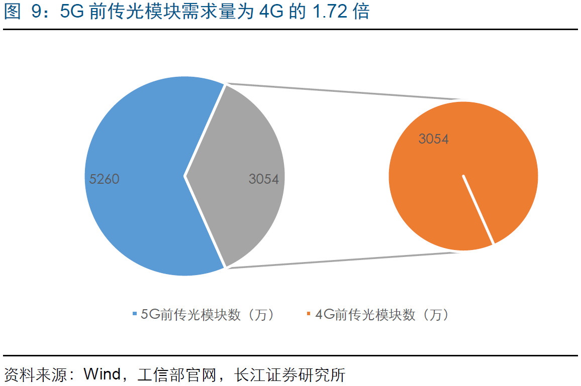 5G 基站建設(shè)或驅(qū)動(dòng) 2019 年全球基站光模塊市場(chǎng)增長(zhǎng) 30.56%:2018 年,華為 5G 基站出貨量近一萬(wàn),驅(qū)動(dòng)國(guó)內(nèi)首個(gè) 5G 基站光模塊訂單落地,電信光模塊行業(yè)進(jìn)入“5G 時(shí)間”。2019 年,伴隨全球 5G 增量資本開(kāi)支規(guī)模放量,電信光模塊市場(chǎng)增速或企穩(wěn)回升。根據(jù)我們的預(yù)測(cè),2019 年國(guó)內(nèi) 5G 基站新建數(shù)為 10 萬(wàn)站左右,全球或達(dá) 15 萬(wàn)站,考慮一個(gè)基站 6 個(gè)前傳 25G 光模塊,單價(jià) 80 美元附近,5G 基站光模塊增量市場(chǎng)近 0.72億美元。2019 年國(guó)內(nèi) 4G 基站新建數(shù)預(yù)計(jì)為 20 萬(wàn),全球預(yù)計(jì) 30 萬(wàn),4G 基站光模塊單價(jià) 12 美元附近,4G 基站光模塊市場(chǎng)約為 0.22 億美元,合計(jì)基站光模塊市場(chǎng) 0.94 億美元;我們預(yù)計(jì) 2018 年國(guó)內(nèi) 4G 基站新建數(shù)為 50 萬(wàn)左右,全球 80 萬(wàn)左右,考慮一個(gè)基站 6 個(gè)前傳 25G 光模塊,單價(jià) 15 美元附近,4G 基站光模塊市場(chǎng) 0.72 億美元。2019年全球基站光模塊市場(chǎng)增速或達(dá) 30.56%。