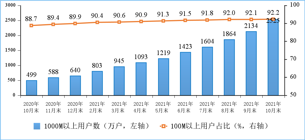 圖3 2020年-2021年10月份末100M速率以上、1000M速率以上的固定互聯(lián)網寬帶接入用戶情況
