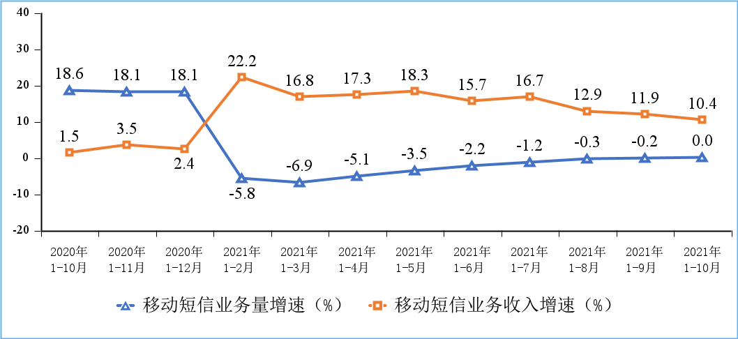圖8 2020-2021年1-10月份移動短信業(yè)務量和收入同比增長情況