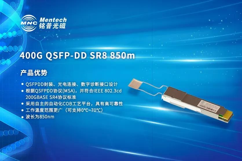 銘普光磁的400G QSFPDD SR8將8個(gè)發(fā)射器和8個(gè)接收器集成到一個(gè)模塊中,每個(gè)通道25Gbd,并采用PAM4調(diào)制格式,調(diào)制成50Gb/s,目前已有DSP和CDR兩種不同方案。