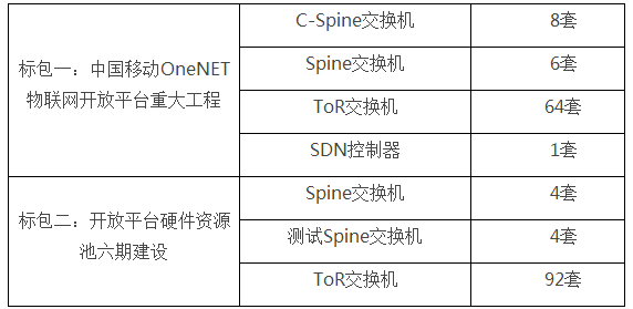 該數(shù)據(jù)中心交換機(jī)和SDN控制器采購項(xiàng)目分為2個(gè)標(biāo)包,共179套設(shè)備,標(biāo)包一為中國移動(dòng)OneNET物聯(lián)網(wǎng)開放平臺(tái)重大工程設(shè)備79套,標(biāo)包二為開放平臺(tái)硬件資源池六期建筑設(shè)備100套。2個(gè)標(biāo)包所采購的所有硬件設(shè)備及軟件須在項(xiàng)目合同簽訂后30個(gè)日歷天內(nèi)全部送達(dá)至中移物聯(lián)網(wǎng)有限公司指定地點(diǎn)。