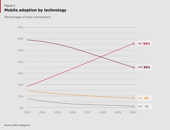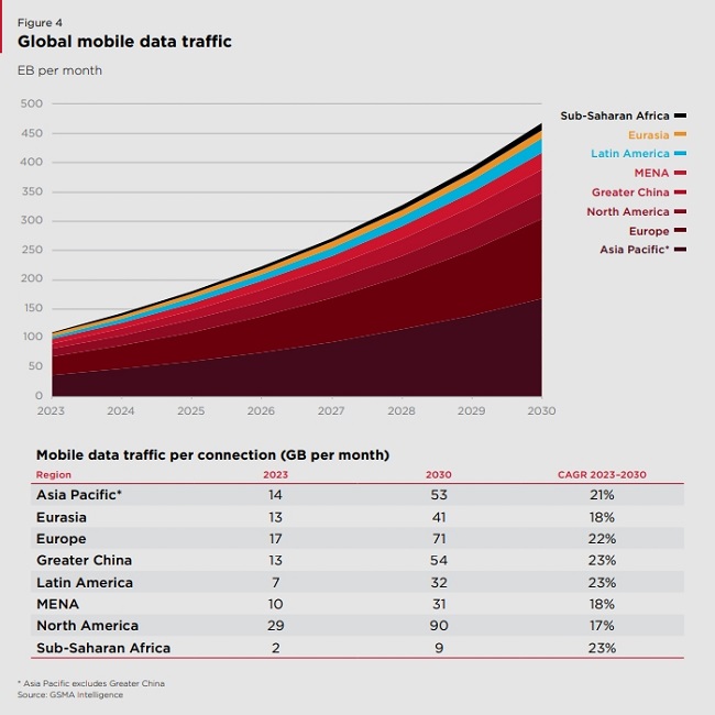 GSMAi預(yù)測(cè),從現(xiàn)在到2030年,移動(dòng)數(shù)據(jù)流量將增長(zhǎng)四倍,5G覆蓋范圍和容量的擴(kuò)大將發(fā)揮重要作用,這表明持續(xù)基礎(chǔ)設(shè)施投資的重要性。據(jù)預(yù)測(cè),全球每個(gè)連接的每月移動(dòng)數(shù)據(jù)流量將從2023年的12.8GB增長(zhǎng)到2030年的47.9GB。