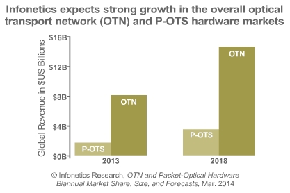 ICCSZ訊 2014年3月10日,市場調(diào)研公司Infonetics發(fā)布其最新的關(guān)于OTN(光傳輸網(wǎng)絡(luò))和分組光硬件市場報(bào)告,以分析OTN交換和傳輸設(shè)備,以及分組光傳輸系統(tǒng)(P-OTS)市場情況。