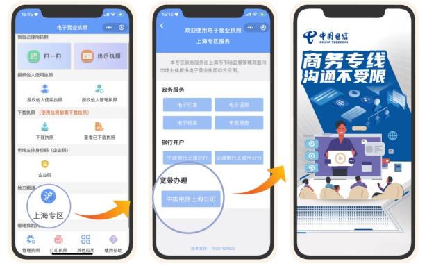 儀式上,電子營業(yè)執(zhí)照新功能正式啟用。依托該功能,上海電信率先在電子營業(yè)執(zhí)照小程序中加載電信寬帶辦理入口,為中小企業(yè)客戶提供更加便利快捷的寬帶在線辦理服務。企業(yè)用戶只需在電子營業(yè)執(zhí)照小程序上完成身份認證,即可在線“一鍵直達”辦理電信企業(yè)寬帶。