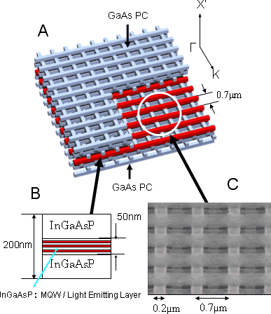 三維光子晶體,是可將光粒封在內(nèi)部的半導體晶體。在埋入以其他半導體材料制作的小球狀物,也可同時聚集電子。此種晶體外部受到光線照射時,晶體內(nèi)的光和電子會重復地交互作用,使光放大增加,進而產(chǎn)生效率極佳的激光。與以往的半導體激光器相比,組件中產(chǎn)生的光能以1000倍左右的高效率提取。
