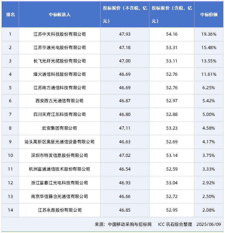 中國(guó)移動(dòng)47億元光纜集采結(jié)果公示:14家廠商中標(biāo) 均價(jià)降幅顯著
