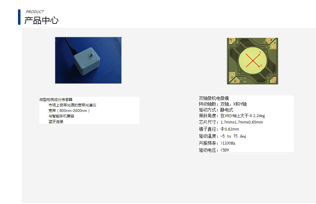 公司的光學(xué)MEMS技術(shù)處于國際領(lǐng)先水平,主要產(chǎn)品包括:MEMS光衰減器(VOA),MEMS光開關(guān)(switch & array),微型物質(zhì)成分傳感器(material sensor)。