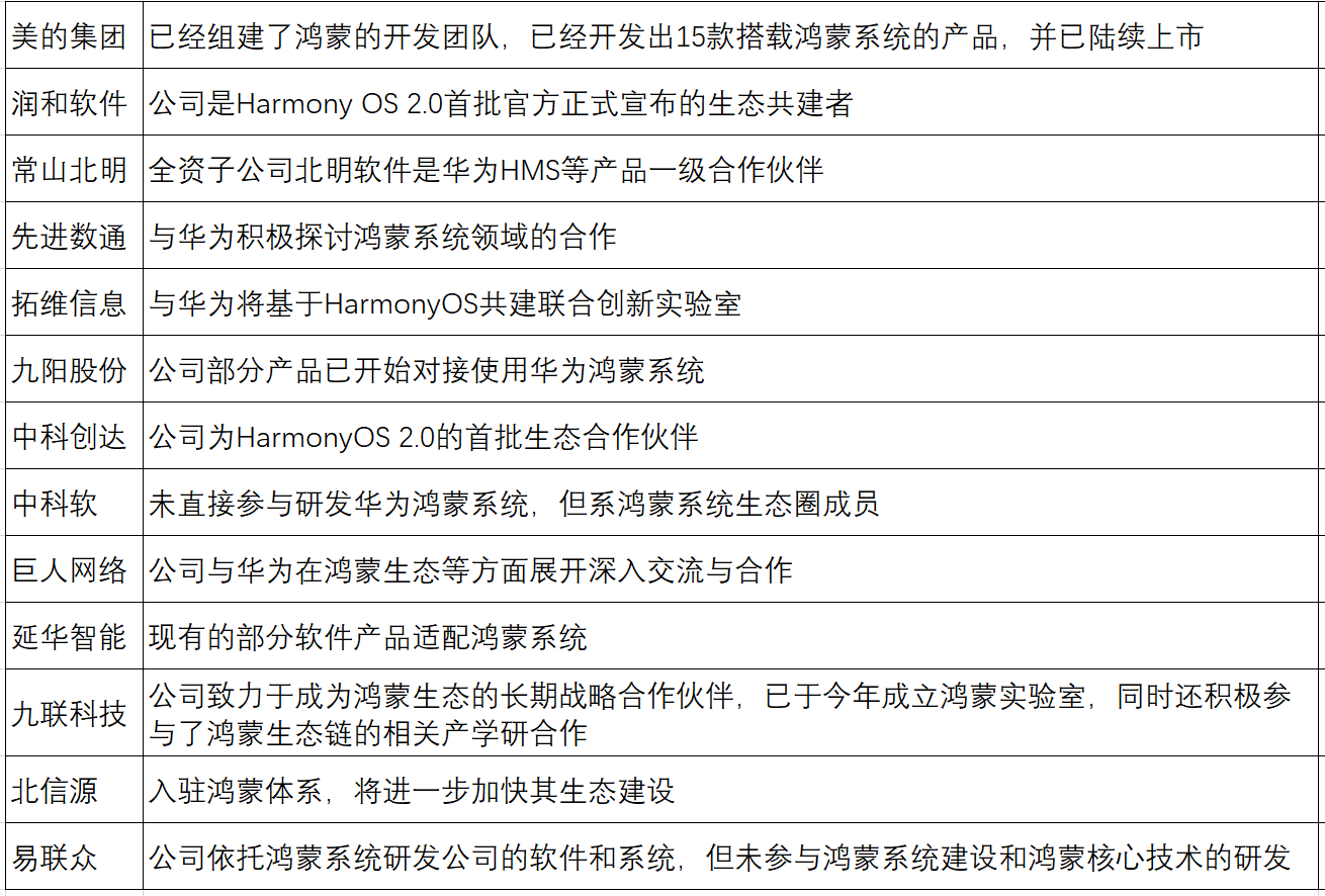 目前華為鴻蒙生態(tài)合作伙伴包括美的集團、潤和軟件、九陽股份等企業(yè),開發(fā)了眾多創(chuàng)新鴻蒙生態(tài)產(chǎn)品,涉及智能家居設備、智能運動健康設備、智能辦公設備等。從目前來看,接入鴻蒙操作系統(tǒng)的企業(yè)還是以小廠商為主。