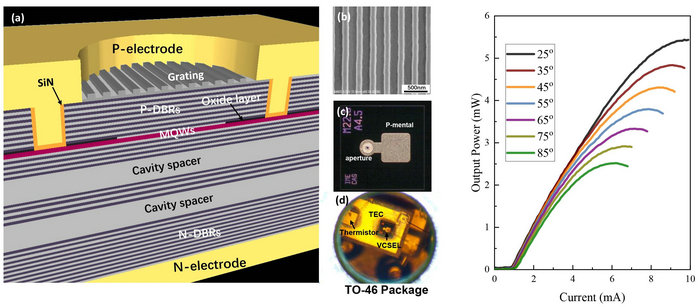 圖 1 新型VCSEL的結構示意圖和不同溫度下的光功率曲線