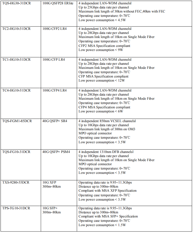 截止目前,泰瑞創(chuàng)擁有多項(xiàng)相關(guān)專利,產(chǎn)品已通過了UL/ FDA/TUV等安規(guī)認(rèn)證,以及ISO9001質(zhì)量管理體系認(rèn)證。產(chǎn)品主要有100G QSFP28,40G QSFP+,10G SFP+,10G XFP, 10G BIDI,Copper, SGMII等。