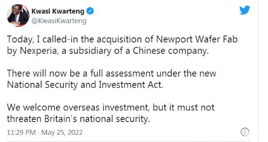 ICC訊 據(jù)《環(huán)球網(wǎng)》報道,當(dāng)?shù)貢r間25日,英國商業(yè)、能源和產(chǎn)業(yè)戰(zhàn)略大臣夸西夸騰表示,將對中企聞泰科技的全資子公司——安世半導(dǎo)體收購英國最大芯片制造商 Newport Wafer Fab (NWF)一事進(jìn)行審查。