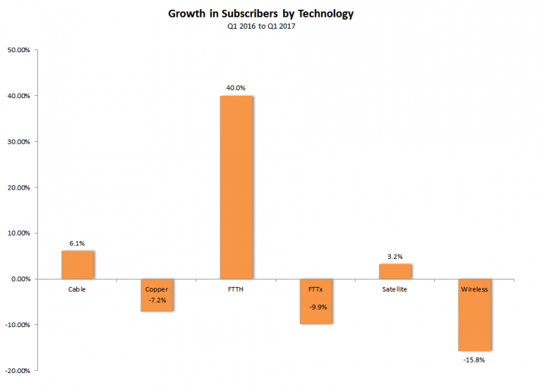 在年度變化方面,全球的銅線數(shù)量下降了7%, 而FTTH用戶數(shù)在2016年第一季度到2017年第一季度之間上升了40% (圖6)。這個數(shù)字與之前一個季度相比略有所下降,但是光纖替代銅線的趨勢依然明顯。FTTX的負(fù)增長主要是由于FTTH在中國大規(guī)模的替代了FTTX.同時,固定的無線技術(shù)在逐漸的給基于4G LTE的移動寬帶接入鋪路。實際上,在一些國家和地區(qū)這被認(rèn)為是一種提供家庭連接寬帶的方式,例如斯堪的納維亞和東歐。