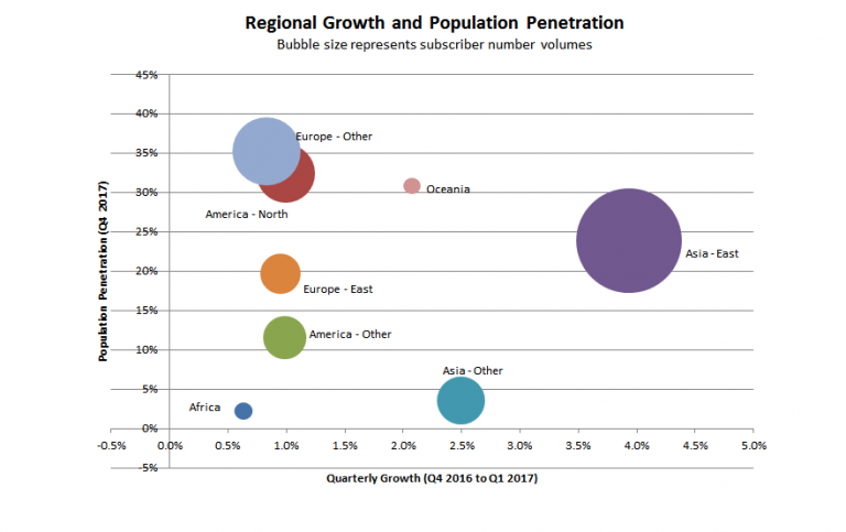 圖4 各區(qū)域的滲透率和季度增長率(圓的大小代表了2017年第一季度的用戶數(shù)量)