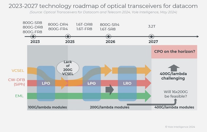 對(duì)400G和800G數(shù)據(jù)通信收發(fā)模塊的需求,尤其是來(lái)自英偉達(dá)、谷歌和亞馬遜的需求,顯著影響了收入。Coherent和旭創(chuàng)分別領(lǐng)先于多模和單模應(yīng)用。業(yè)界正在從每通道100Gb/s向每通道200Gb/s的800G鏈路轉(zhuǎn)變,旨在降低功耗和成本。EML和CW-DFB器件已準(zhǔn)備好用于200G/lane應(yīng)用,而200G/lambda VCSEL預(yù)計(jì)將于2026年投入批量生產(chǎn)。