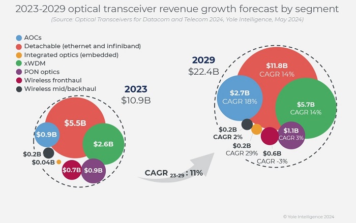 2023年,全球光收發(fā)器市場(chǎng)的收入從2022年的110億美元略微下降到109億美元,但由于云服務(wù)運(yùn)營(yíng)商和國(guó)家電信運(yùn)營(yíng)商對(duì)400G以上高數(shù)據(jù)速率模塊的高需求,預(yù)計(jì)該市場(chǎng)到2029年將達(dá)到224億美元。由于英偉達(dá)的大量人工智能基礎(chǔ)設(shè)施訂單和數(shù)據(jù)中心網(wǎng)絡(luò)升級(jí)到800G,預(yù)計(jì)2024年的收入增長(zhǎng)率將達(dá)到27%。