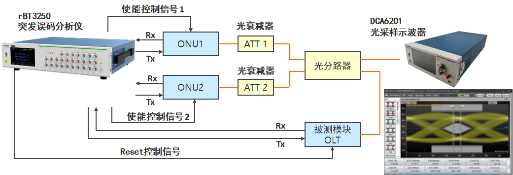 如圖a所示,搭建50G PON 突發(fā)測試環(huán)境,主要由兩個ONU模塊和一個OLT模塊組成。突發(fā)誤碼測試儀兩個突發(fā)通道PPG時分交替發(fā)送具備突發(fā)幀結(jié)構(gòu)的數(shù)據(jù)(preamble & Data)及激光器使能信號(enable),使兩個ONU模塊交替發(fā)送突發(fā)數(shù)據(jù),分別經(jīng)過衰減器,模擬不同長度光纖上的功率衰減,經(jīng)過分光路器合成一路光,接入OLT模塊。突發(fā)誤碼測試儀ED向OLT發(fā)送reset信號并接收突發(fā)數(shù)據(jù),進行兩路突發(fā)誤碼比較。