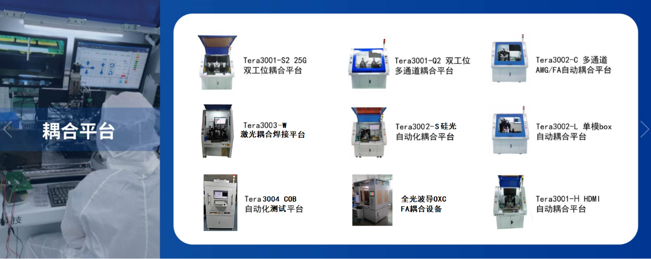 灣泰若科技主營產(chǎn)品范圍光電封裝自動化設(shè)備和誤碼儀測試設(shè)備兩大類。光電封裝自動化設(shè)備包括10~800G COB自動化耦合封裝系統(tǒng),單模BOX自動耦合封裝設(shè)備,單模AWG自動化耦合封裝系統(tǒng),TOSA 耦合激光焊接設(shè)備,100G~800G硅光FA耦合設(shè)備,誤碼儀測試設(shè)備設(shè)備10G~100G誤碼儀Tera2100、1~10G 誤碼儀Tera2060及400G /800G 誤碼儀Tera2400等系列高速誤碼儀, 光模塊分析儀(Tera2140)。
