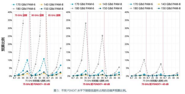 高密度連接器的相鄰信號串?dāng)_會占用噪聲預(yù)算,噪聲代價隨串?dāng)_水平降低而減弱,隨信號損耗增加而上升。共封裝銅纜因低損耗表現(xiàn)更優(yōu);PAM6 在 90 GHz 的串?dāng)_水平高于 PAM8 在 75 GHz 的表現(xiàn),承受更高噪聲代價,但信道帶寬達標(biāo)時 PAM6 性能更優(yōu)。需通過新型屏蔽技術(shù)和插配接口設(shè)計抑制串?dāng)_,提升傳輸距離。