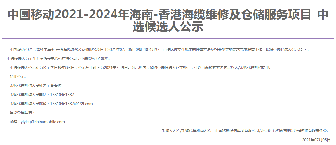 ICC訊 (編輯:Nicole) 中國移動公示2021-2024年海南-香港海纜維修及倉儲服務(wù)項目中選候選人,江蘇亨通光電股份有限公司獨家中標。