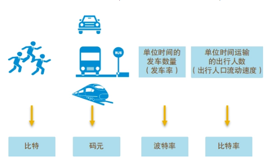 通信系統(tǒng)有點(diǎn)像我們的公共交通運(yùn)輸系統(tǒng)。我們可以把通信系統(tǒng)中碼元類比為公共交通車輛,例如公交車、地鐵、的士……。通信系統(tǒng)所傳輸?shù)谋忍財(cái)?shù)量類比為出行的人,則比特率為出行人口流動(dòng)速度,波特率就是發(fā)車率。