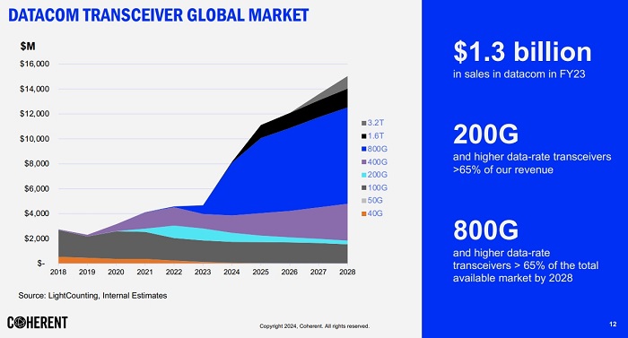AI/ML:公司的人工智能/機器學習(AI/ML)相關數(shù)據(jù)通信收發(fā)器連續(xù)第三個季度獲得強勁訂單。800G收入環(huán)比增長超過100%,自首次發(fā)貨以來僅一年多的時間就超過了1億美元的季度門檻,這標志著該產(chǎn)品是公司歷史上收入增長最快的產(chǎn)品之一。且公司預計第三財季800G出貨量將環(huán)比增長,第四財季也將環(huán)比增長,因為該產(chǎn)品需求正處于攀升期。Coherent曾表示,2024財年,公司超過50%的數(shù)通收發(fā)器收入將來自于人工智能相關的應用。但Coherent也表示,幾乎所有增長都來自800G,而沒有考慮到數(shù)通中非人工智能業(yè)務的任何巨大反彈。此外,Coherent對大客戶在1.6T收發(fā)器和器件方面的積極參與感到興奮。為響應客戶需求,公司將繼續(xù)朝著預期在2025財年推出1.6T收發(fā)器和器件的目標前進。