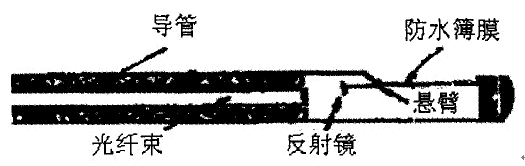 1 壓力測(cè)量。目前臨床上應(yīng)用的壓力傳感器主要用來(lái)測(cè)量血管內(nèi)的血壓、顱內(nèi)壓、心內(nèi)壓、膀胱和尿道壓力等。用來(lái)測(cè)量血壓的壓力傳感器示意見圖1。其中對(duì)壓力敏感的部分是在探針導(dǎo)管末端側(cè)壁上的一塊防水薄膜,一面帶有懸臂的微型反射鏡與薄膜相連,反射鏡對(duì)面是一束光纖,用來(lái)傳遞入射光到反射鏡,同時(shí)也將反射光傳送出來(lái)。當(dāng)薄膜上有壓力作用時(shí)。薄膜發(fā)生形變且能帶動(dòng)懸臂使反射鏡角度發(fā)生改變,從光纖傳來(lái)的光束照射到反光鏡上,再反射到光纖的端點(diǎn)。由于反射光的方向隨反射鏡角度的變化而改變,因此光纖接收到的反射光的強(qiáng)度也隨之變化。這一變化通過(guò)光纖傳到另一端的光電探測(cè)器變成電信號(hào),這樣通過(guò)電壓的變化便可知探針處的壓力大小。