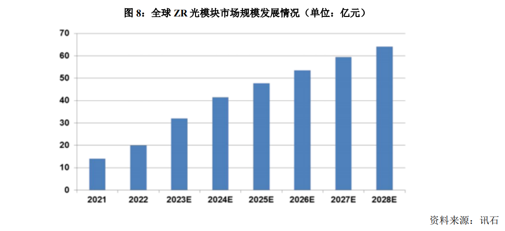 隨著單通道傳輸速率的提高,現(xiàn)代光通信領(lǐng)域越來越多的應(yīng)用場景開始用到相干光傳輸技術(shù),相干技術(shù)也從過去的骨干網(wǎng)下沉到城域甚至邊緣接入網(wǎng)。根據(jù)Dell'Oro 最新報告,未來五年光傳輸設(shè)備的需求預(yù)計將達(dá)到830億美元。與前五年相比,這一累計收入增長了10%,主要來自相干DWDM系統(tǒng)的銷售。Omdia預(yù)計2025年相干將達(dá)到250萬支規(guī)模;2022-2025 年,400G相干光模塊年復(fù)合增長率將超40%。訊石預(yù)測,2023年-2028年,ZR光模塊市場規(guī)模將從約30億元,增長到超過60億元。