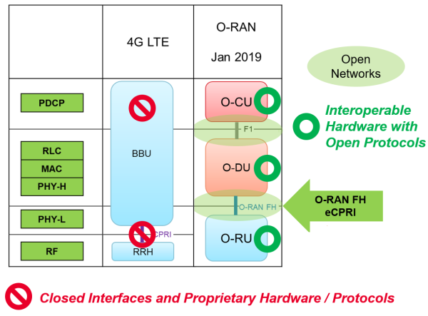 4G LTE RAN與5G O-RAN的主要組件顯示,BBU被O-RU、O-DU和O-CU取代,這在網(wǎng)絡架構中提供了更大的靈活性