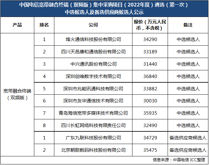 ICC訊 今日,中國電信公布寬帶融合終端(雙頻版)集中采購項(xiàng)目(2022年度)遴選(第一次)中選候選人及備選供應(yīng)商候選人,烽火通信、天邑康和、中興通訊、海信寬帶等10家廠商入選。