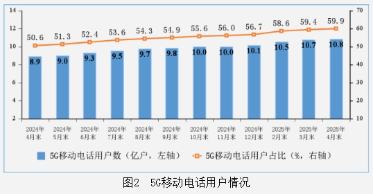 在用戶發(fā)展方面,固定寬帶接入用戶穩(wěn)步增長。截至4月末,全國固定互聯(lián)網(wǎng)寬帶接入用戶達(dá)6.8億戶,其中千兆及以上用戶達(dá)2.2億戶,占比提升至32.4%。移動電話用戶總數(shù)達(dá)18.03億戶,5G用戶規(guī)模突破10.81億戶,占比達(dá)59.9%,顯示出5G網(wǎng)絡(luò)應(yīng)用的快速普及。