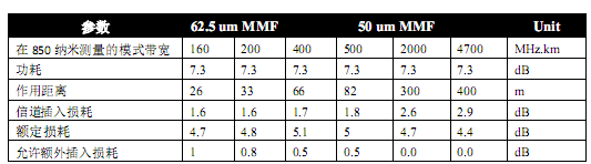 圖1:10G以太網(wǎng)(10gbase SR)作用距離和損耗預算表