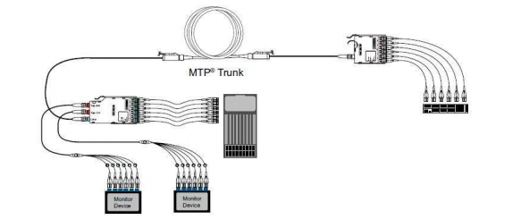 在下面的光TAP基礎(chǔ)設(shè)施的例子中,我們使用了光學降階評估表基于光纖類型、TAP模塊和基礎(chǔ)設(shè)施中MTP/LC模塊的數(shù)量以確定適用的數(shù)據(jù)速率的信道的距離。為了支持協(xié)議數(shù)據(jù)速率的降階評估表距離,現(xiàn)場信號應大于或等于給定光纖類型的基礎(chǔ)設(shè)施光纜總長度。對于光纖通道的應用,任何協(xié)議,無論光纖類型,監(jiān)視器鏈路的最大距離不能超過20米。對于以太網(wǎng)應用程序監(jiān)視鏈路距離通常不是一個問題;查詢請聯(lián)系康寧光通信技術(shù)支持熱線。