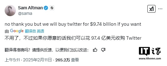 對(duì)于這一消息,阿爾特曼在 X 平臺(tái)上回應(yīng)稱:“不用了,謝謝,但如果你愿意,我們可以以 97.4 億美元(當(dāng)前約 711.84 億元人民幣)的價(jià)格收購(gòu)?fù)铺亍!?/strong>