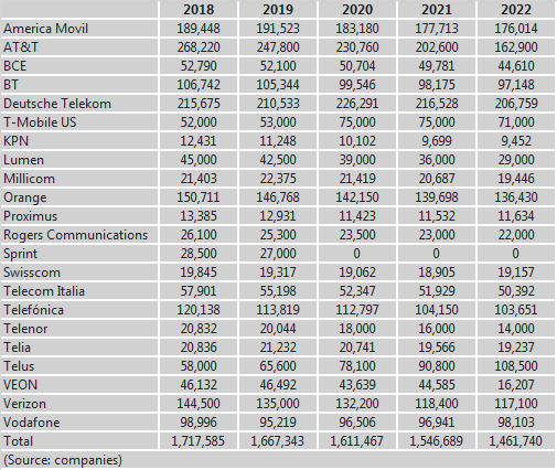 撤資并非意味著所有這些工作都被取消了。在某些情況下,人們只是發(fā)現(xiàn)他們?cè)跒榱硪粋€(gè)雇主工作(至少最初是這樣)。例如,沃達(dá)豐(Vodafone)龐大的印度子公司與Idea Cellular合并后的情況就是如此。西班牙Telefonica等公司出售塔樓,不僅需要轉(zhuǎn)移混凝土和鋼材,還需要轉(zhuǎn)移員工。AT&T決定分拆旗下的華納傳媒業(yè)務(wù)(WarnerMedia),該業(yè)務(wù)目前已與探索頻道(Discovery)合并為一家合資企業(yè),這在很大程度上解釋了去年員工凈減少的原因。