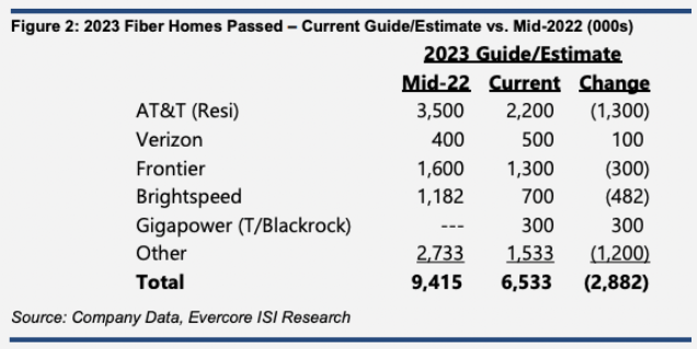 Evercore分析師曾預(yù)測,美國光纖服務(wù)供應(yīng)商計劃在2023年期間總共新建940萬個地點(diǎn),但現(xiàn)在他們預(yù)計這一數(shù)字將在650萬左右。