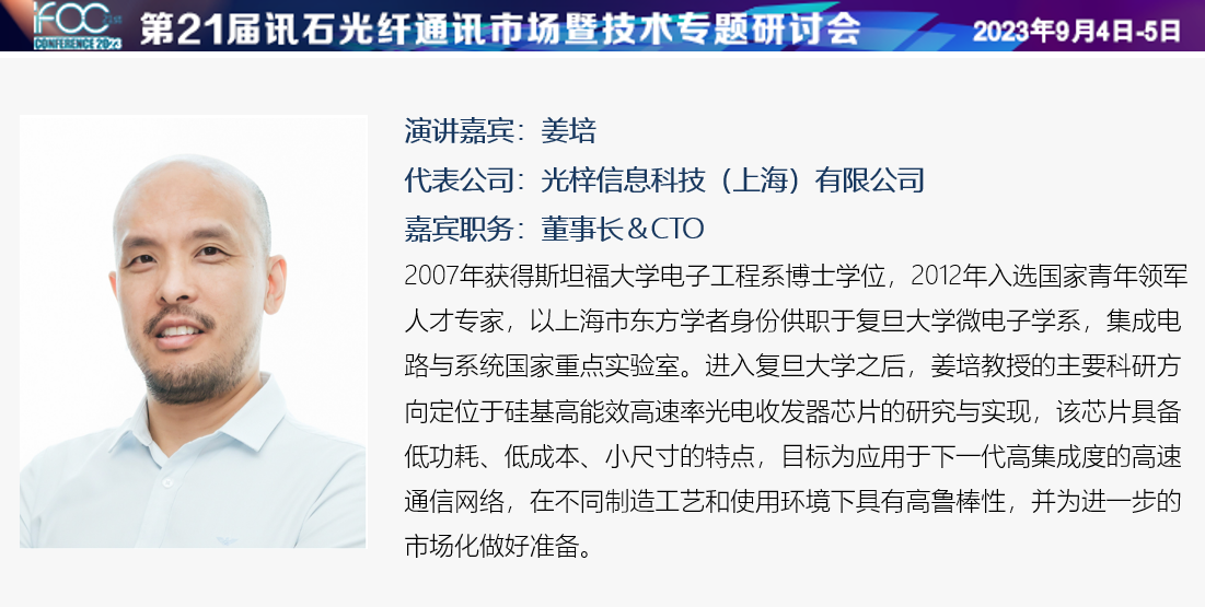 本屆iFOC訊石研討會(huì),光梓信息科技(上海)有限公司董事長(zhǎng)&CTO姜培博士將發(fā)表《硅基光互連電芯片的開(kāi)發(fā)和產(chǎn)業(yè)化》行業(yè)報(bào)告。本報(bào)告將闡述硅基光互連電芯片的演進(jìn),極少基于CMOS工藝的25G/λ收發(fā)電芯片的研發(fā)和產(chǎn)業(yè)化,以及基于BiCMOS工藝的50G & 100G/λ收發(fā)電芯片的研發(fā)和產(chǎn)業(yè)化。