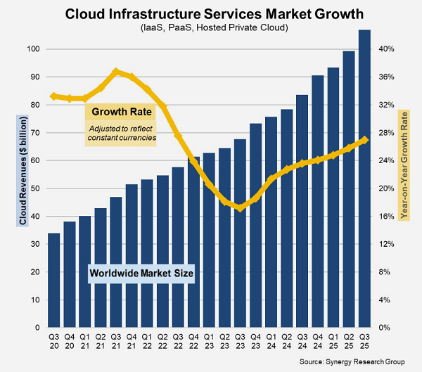 ICC訊 來自Synergy研究集團(tuán)的最新數(shù)據(jù)顯示,2025年第三季度,企業(yè)在云基礎(chǔ)設(shè)施服務(wù)上的支出較上一季度猛增超過75億美元,這是迄今為止最大的環(huán)比增幅。在剔除了該期間一些主要貨幣波動的影響后,這一數(shù)據(jù)較去年第三季度增長了28%,標(biāo)志著同比增長率連續(xù)第八個季度上升,同時也是該市場三年來最高的增長率。