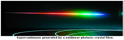 超連續(xù)譜(SC)是高功率密度脈沖激光通過非線性介質(zhì)產(chǎn)生的強(qiáng)烈光譜展寬,利用光脈沖在光子晶體光纖中的自相位調(diào)制(SPM)、受激喇曼散射(SRS)以及四波混頻(FWM)等非線性效應(yīng),可使輸入脈沖展寬得到超連續(xù)譜,在超連續(xù)光譜中取出特定波長的激光就可以制造不同波長的新型光源。超連續(xù)譜光源在飛秒激光脈沖的相位穩(wěn)定、光學(xué)相干層析(OCT)、超短脈沖壓縮、激光光譜學(xué)和傳感技術(shù)等領(lǐng)域具有廣泛的應(yīng)用。