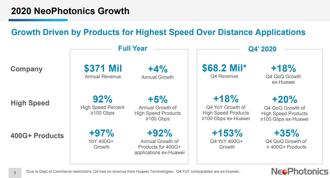 ICC訊(編譯:Nina)美國加州圣何塞--2021年2月25日--新飛通公司(NeoPhotonics Corporation)(紐交所:NPTN)今天公布了其截至2020年12月31日的第四季度和全年財務業(yè)績。