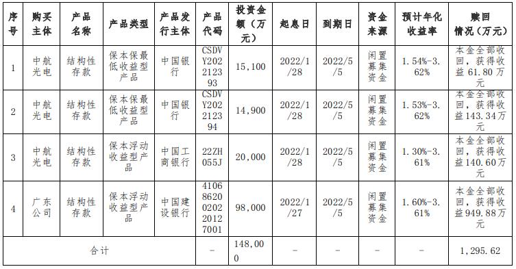 此外,公告還披露了截至本公告日的中航光電前十二個月累計使用募集資金進行現(xiàn)金管理的具體情況,詳情如下: